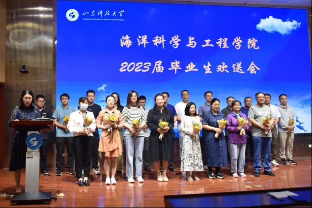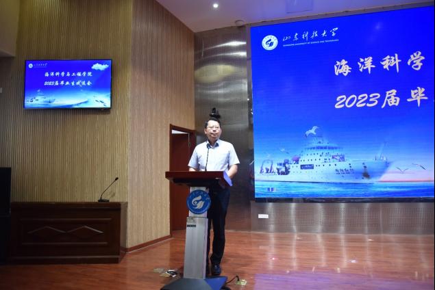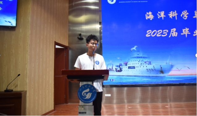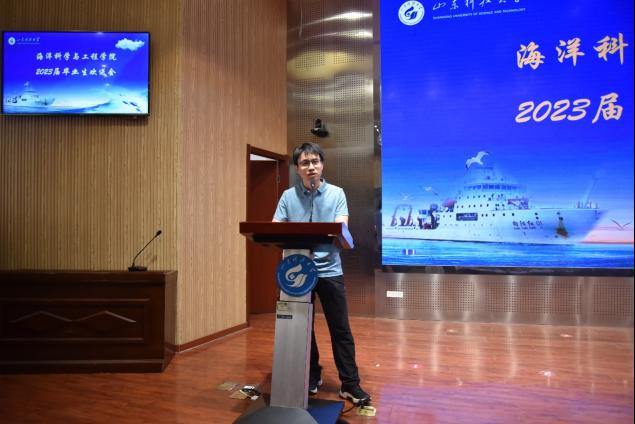 毕业生代表测控技术与仪器2019-1苗展同学、在校生代表海洋技术2021-3宋明艳同学依次发言。苗展同学回忆了大学生活中自己的成长与蜕变,表达了对学校近年来取得的发展成就的感慨,以及未来争做栋梁的决心与抱负。宋明艳同学对学院和师长们表达了诚挚的感谢,并祝愿学长学姐们奋发有为,为科大发展贡献青春力量。教师代表海洋技术系教师、2023年“我最难忘的恩师”林磊老师发言,他用两个专业领域的公式在最后一堂课上教会同学们从今往后从容地面对人生中的种种起伏,不忘母校教诲,做到锐意进取,求真务实。