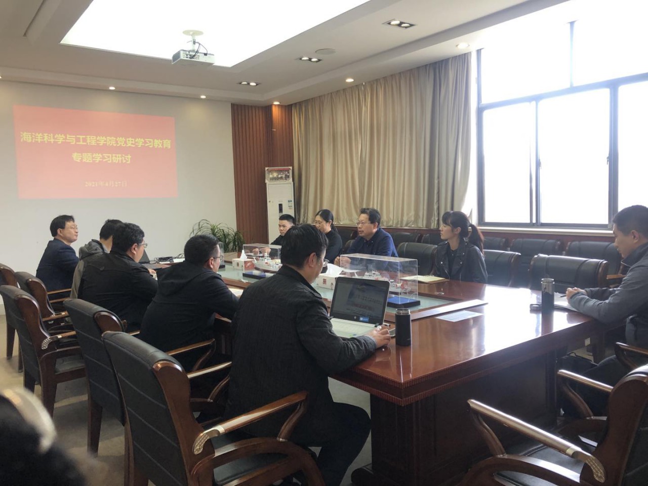 在交流研讨阶段,执行院长杜立彬、副院长李洪宇进行重点发言。杜立彬强调,开展党史学习教育,要坚持学史明理、学史增信、学史崇德、学史力行,带头学习、自觉学习,汲取前进力量,把开展党史学习教育与推动实际工作结合起来,认真履职尽责,做到在学党史中坚定理想信念、在学党史中厚植为民情怀、在学党史中力行担当实干,为高水平建设海洋学科做出积极贡献,以优异成绩迎接建党一百周年。李洪宇表示,作为高校教师,要把思想和行动统一到习近平总书记重要讲话精神上来,增强“四个意识”、坚定“四个自信”、做到“两个维护”,深刻认识、准确把握开展党史学习教育的重大意义、工作要求。做到学党史与学院改革发展相结合、学党史与学科发展相结合、学党史与解决师生实际问题相结合;切实服务教学科研、服务师生员工,把党建思想政治工作做成触动人心、温暖人心、凝聚人心的真情工作,让广大师生员工深切感受到学院发展的美好未来,并为之努力。